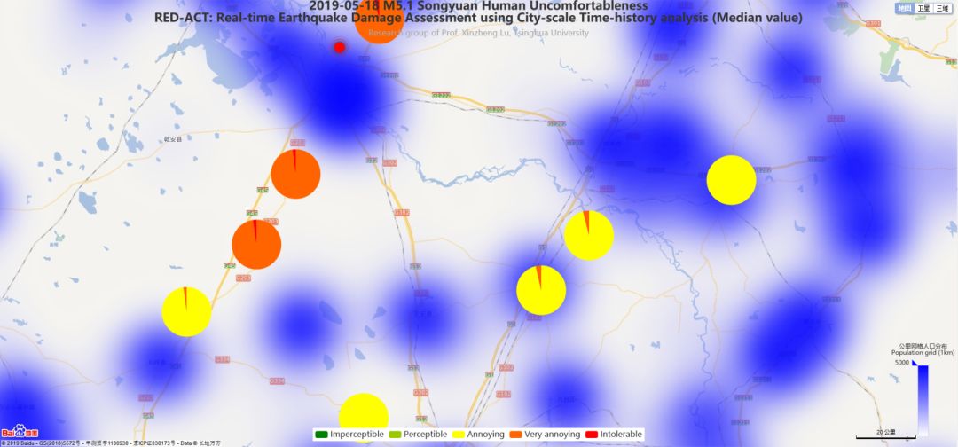 利用密布强震台网在震后获取的实时地震动信息,再结合城市抗震弹塑性分析,就可以得到地震发生后不同地点的建筑破坏情况,为抗震救灾决策提供科学支撑。图4为根据20190518吉林松原市宁江区5.1级地震震中附近范围内台站记录分析得到的建筑震害分布示意图,图5为根据20190518吉林松原市宁江区5.1级地震震中附近范围内台站记录分析得到的人员加速度感受分布示意图。