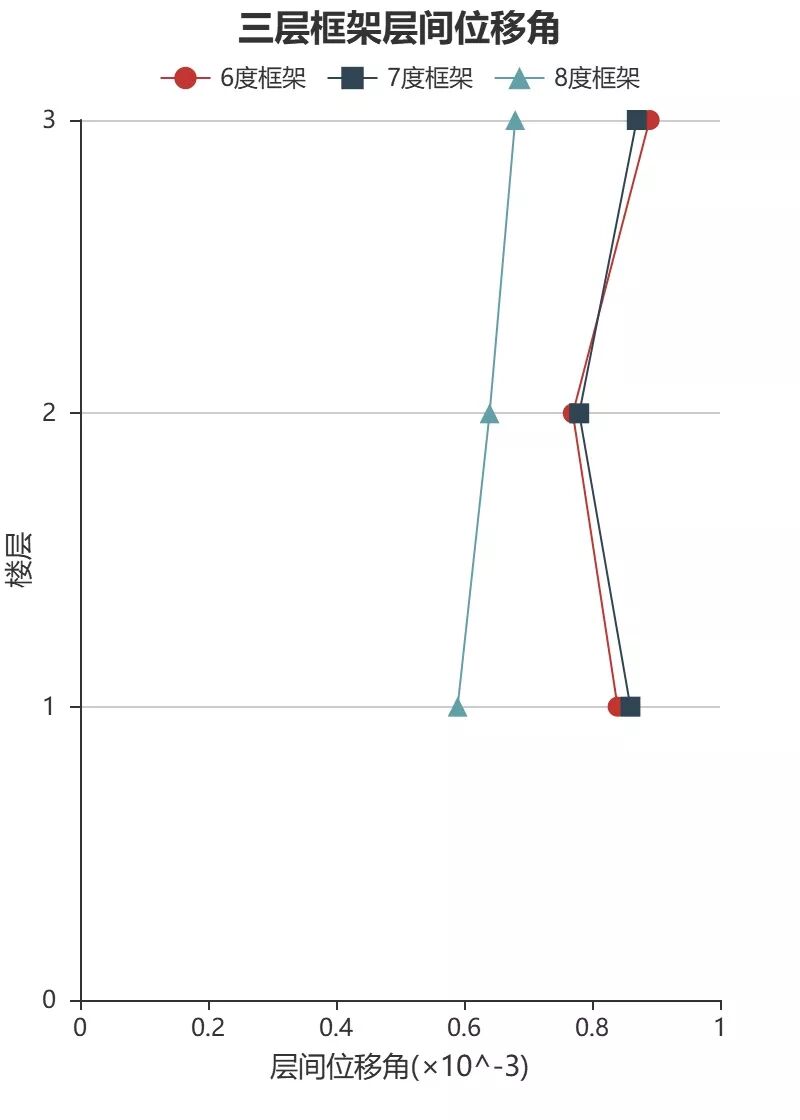 将22FHT台站记录输入立面布置如图7 (a)所示的6度、7度和8度设防的典型三层钢筋混凝土框架结构,得到其层间位移角包络如图7 (b)所示。