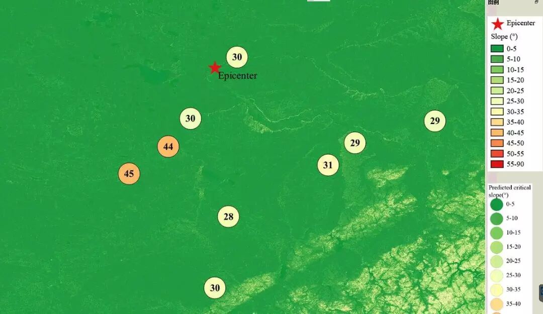 根据当地地形数据、岩性数据和实测地面运动记录,可以计算得到不同滑坡体饱和比例下的滑坡分布,如图12所示。其中,底图为当地坡度分布图,每个圆圈代表每个台站的计算结果,圆圈中的数字代表发生滑坡的临界坡度,台站附近坡度大于该数值的地方滑坡发生概率高。