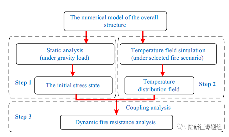 针对火灾引起高层建筑结构失效的安全问题,我们研发了整体结构火灾安全分析方法,其关键科学难题是火灾的长持时热-力耦合准静力行为和倒塌瞬时强非线性动力行为的模拟难题。即我们的计算程序,既要能够模拟几个小时(也就是成千上万秒)的长时间火灾作用,也要能够模拟几秒钟的快速倒塌过程。这给程序的编写和计算造成了很大的挑战。为此,我们开发了如图1所示的计算框架。