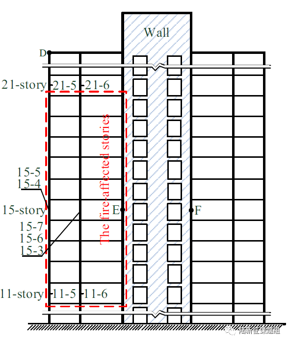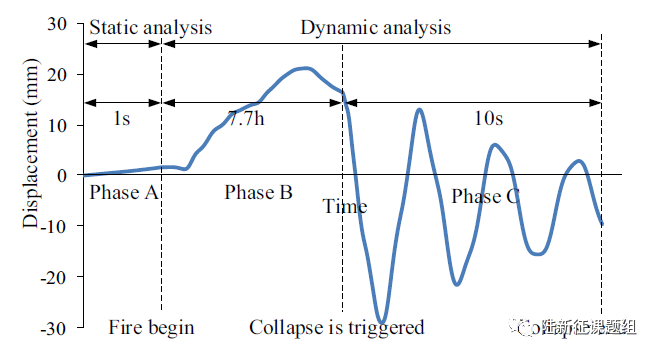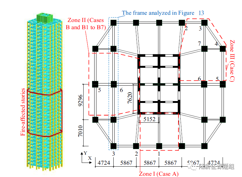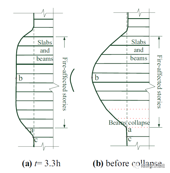 对于此类超高层建筑而言,其整体结构火灾行为研究是非常有必要的。因为构件之间存在复杂的相互影响和约束,使得其破坏机理与常规概念差异显著。例如,一个典型的破坏过程是首先火灾引起梁和楼板的膨胀,进而造成柱子变形,形成很大的附加弯矩。而后当梁和板在长时间高温作用下失效后,柱子失去侧向约束,在轴力以及温度变形引起的二阶效应下,柱子出现倒塌破坏。但是,由于整体结构内力重分布能力很好,因此即便柱子破坏后仍具有较好的抗连续倒塌能力。