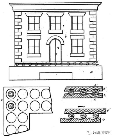 图1 Jules Touaillon的1870隔震结构由隔震系统c-c'支撑。隔震系统c-c'由一系列相对的凹面球面组成,凹球面由圆球分开。(详细构造参见结构图下面的隔震系统的平面图和横截面图)这个拥有150年历史的地震隔震系统提出了现代先进的双凹球面支座支座隔震系统的大部分独特概念。