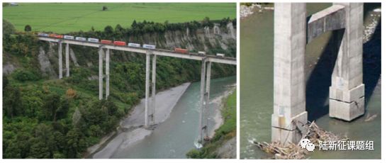 图2 新西兰南朗伊特基铁路桥的照片。桥墩允许提升12.5cm,摇摆运动由扭转屈服的钢梁阻尼器控制,如图3所示。