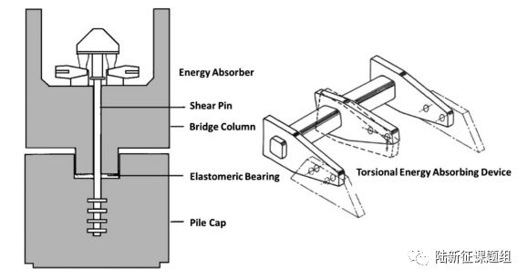 图3 左图:在阶梯状的桥墩底部和桩帽处的扭转屈服钢-阻尼器的连接细节。右图:扭转屈服钢梁阻尼器的示意图。