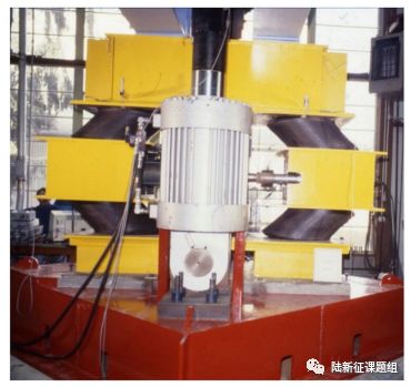 图6 1984年加州大学伯克利分校地震工程研究中心对全尺寸天然橡胶隔离支座进行部件测试。感谢James M. Kelly提供许可。