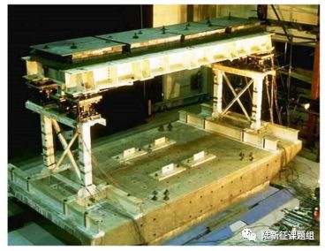 在Michael Constantinou教授的领导下,该实验团队在布法罗大学进行了更多的试验研究。他们使用了桥梁和更高的细长建筑模型,并首次观察到隔震器的抬升现象。模型如图11和图12所示。用于试验的7层模型的重量为211kN,柱子正下方安装有8个隔震器。用于试验的桥梁模型的重量为158kN。