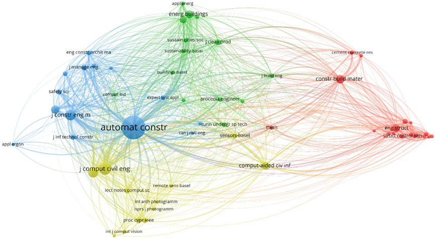 以VOSviewer中的共被引分析功能为基础,我们识别了部分智能建造领域最具影响力的期刊,其结果如图3所示。图中的节点大小代表期刊发表的论文的被引次数总和,节点间边的宽度表示两本期刊发表的论文同时被其他期刊发表的论文引用的次数,节点间的颜色与距离为所代表期刊研究领域的密切程度。可以看出Automation in Construction有着最多的发文量,关注度和影响力较高。