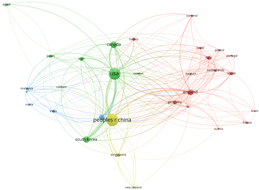 为了探究不同发展层次国家的差异,本文进行了国家间的合作分析。国家合作网络如图4所示。不同于期刊共被引网络图,该图中的节点大小代表着不同国家作者发表论文的数量总和,边的粗细代表了两国作者合作的论文数。图中颜色相同的国家/地区代表着同一个集群,这意味着他们的合作更密切。
