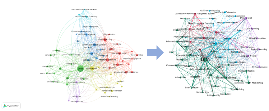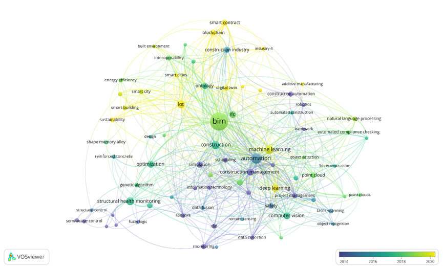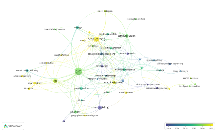 为了进一步发掘智能建造在时间上的发展趋势,本文通过VOSviewer中的时间线叠加网络(timeline-overlayed network)对二者进行了分析,其结果如图8,9所示。