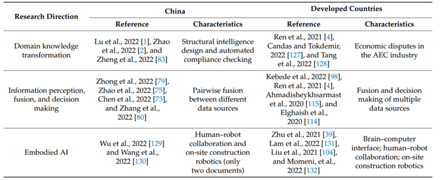 为了更好地对比中国与发达国家的研究前沿,把握智能建造领域的最新研究方向。本文对领域知识抽取、信息感知、融合与决策以及具身智能三个方向的文献进行了总结,详见表4。