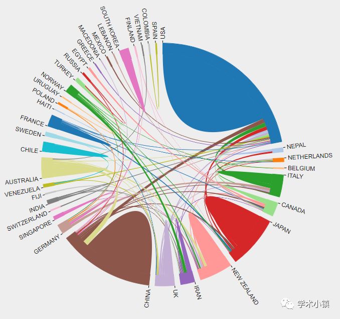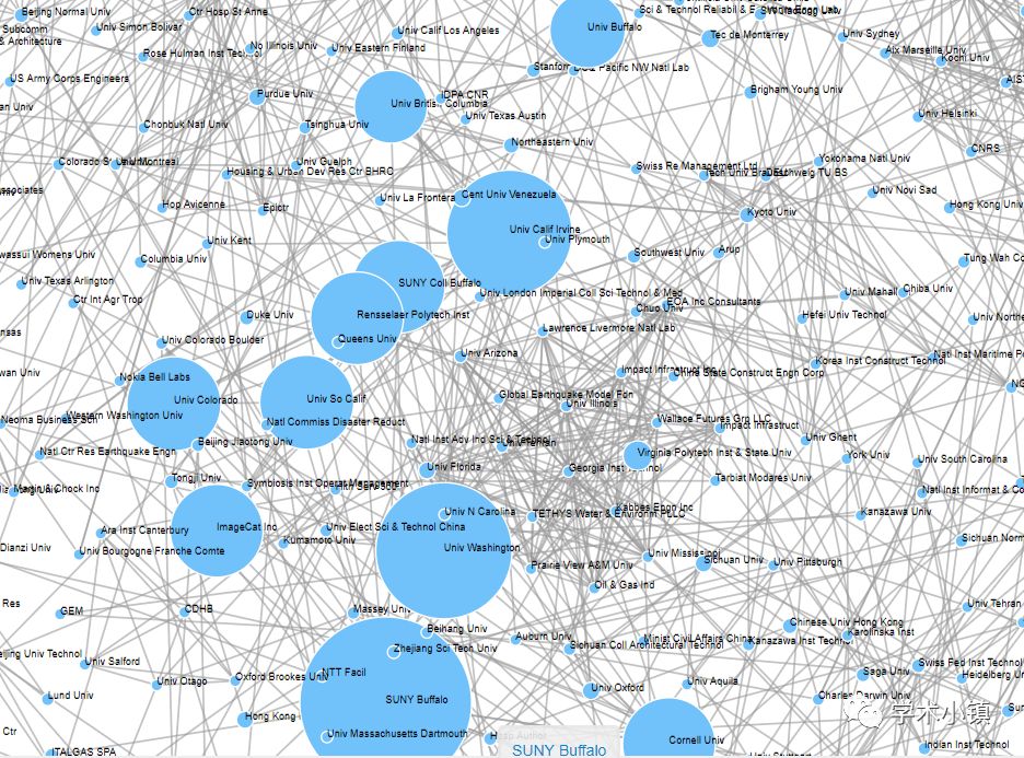 这张图表示机构间的引用关系,哪个圆圈大说明他们的论文引用越多,影响力也越强。