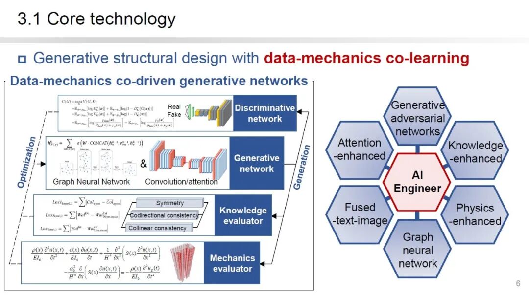 本作品的核心技术为“数据-力学”协同学习的生成式结构设计方法,由生成网络、判别网络、知识评估器和力学评估器组成。将先进的AI技术,如GAN、GNN、Attention等,与结构设计的需求进行了有效结合。