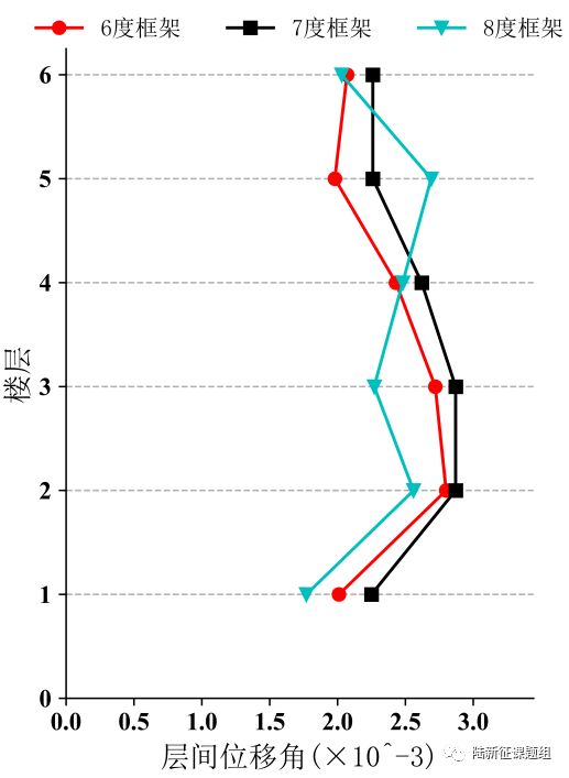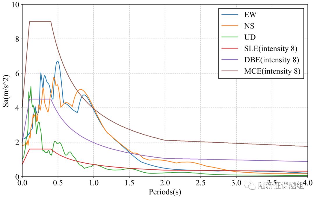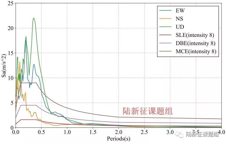 除了地震的复杂性,结构自身的动力特性也有很大的复杂性。如果我们进一步考察617宜宾地震的反应谱和618新泻地震的反应谱,我们可以清晰看出,宜宾地震的反应谱主要集中在短周期段,0.7s以后中长周期段就很不给力了(图3)。而618新泻地震的反应谱在0.7s-1.5s周期段要显著高于617宜宾地震的反应谱值(图4)。所以,如果我们把这两个地震动输入同一组6层框架结构,我们可以显著看出,618新泻地震引起的结构响应要显著高于617宜宾地震的结果(是其2~3倍)(图5)。