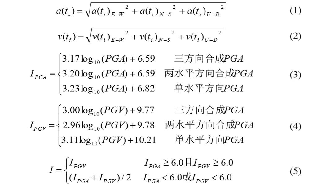 首先根据式(1)、(2)将三个方向的地震动进行合成得到合成地震动的PGA和PGV,接着根据式(3)、(4)和(5)推算得到仪器烈度I、IPGA和IPGV(中国地震局监测预报司, 2015)。