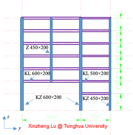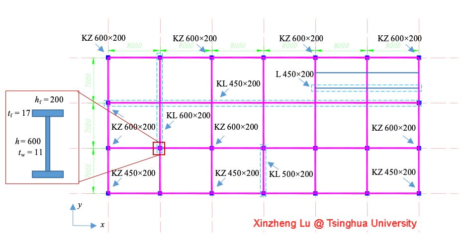 该研究案例的钢结构横向两跨(y方向7m、14m),纵向六跨(x方向每跨8m),标准层平面布置图和典型横向一榀框架图,分别如图1、图2所示,单位mm。钢梁、钢柱均为H型钢,截面尺寸参考《钢结构》教材确定。楼板为120mm厚C30混凝土板。