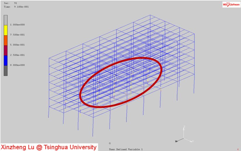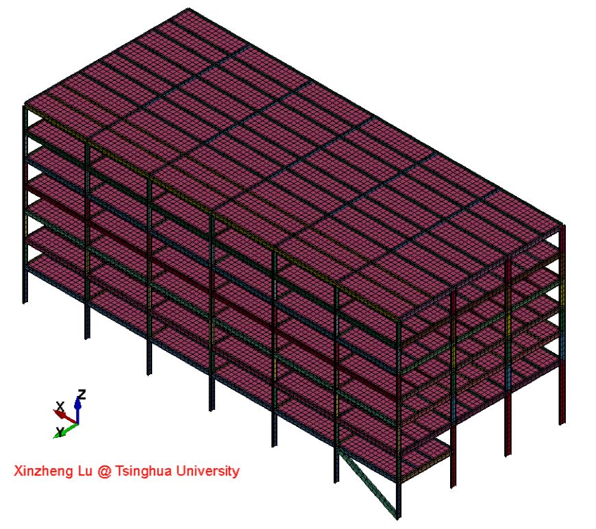 采用MSC.Marc通用有限元软件建立了该钢结构的三维有限元数值模型。其中,钢结构的梁、柱构件均采用清华大学基于MSC.Marc开发的纤维梁模型进行模拟,可考虑钢结构中杆系构件的局部屈曲。混凝土楼板采用弹性单元模拟,楼板荷载通过折算成混凝土楼板的质量来进行考虑,折算后的密度为4252 kg/m^3。