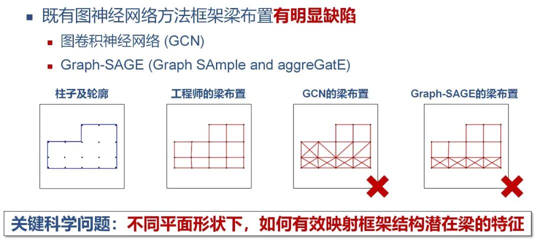 可直接在Graph上运算的图神经网络是Graph数据的有效处理方法。但是现有经典的GNN模型无法有效学习框架梁的布置规律,设计出的梁布置存在明显缺陷,如图2所示。我们要解决的关键难题就是:不同平面形状下,GNN如何有效学习既有设计中框架梁的布置规律。