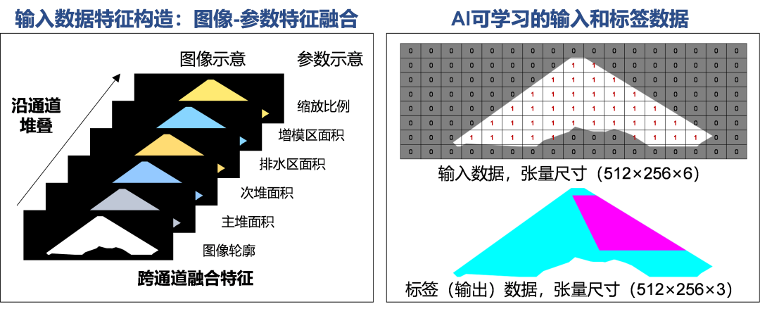 将坝体轮廓图(512×256像素)与分区特征的5个参数(主堆/次堆的堆石料面积归一化比例等)转化为统一的等尺寸二维张量,再将各张量沿着通道方向进行堆叠,形成多模态特征在显式空间融合的多通道张量。其作用相当于让AI同时看懂设计图与材料清单。