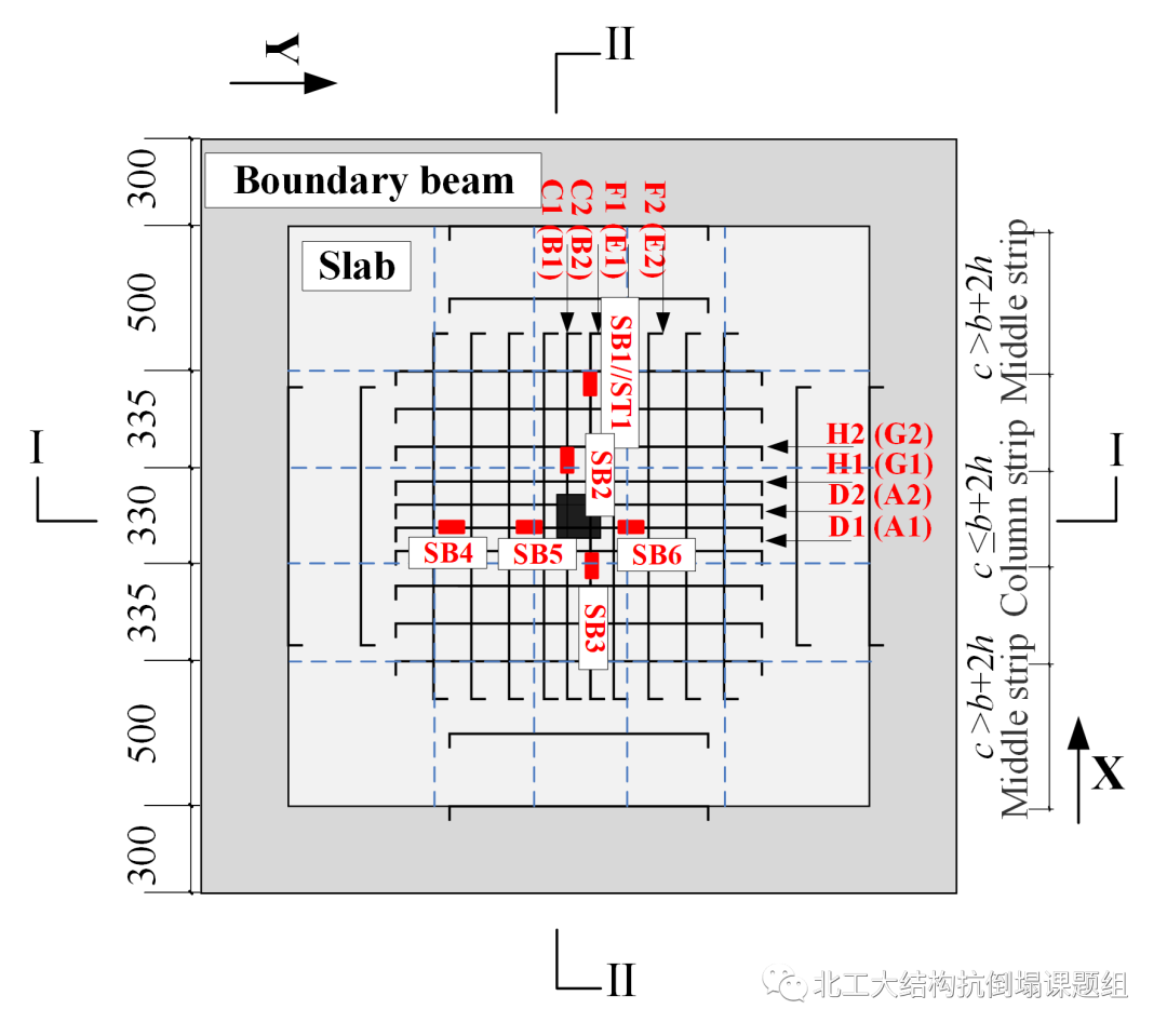 结构原型为柱距6000 mm 的4×4跨平板结构车库,试件取底层中柱节点,如图1所示。当中柱在意外灾害作用下发生初始破坏后,相邻两跨楼板变为一跨楼板,取该场景下反弯点范围以内的楼板和柱作为试验试件。为模拟周边楼板的面内约束,试件楼板边缘和大尺寸边界梁整体现浇,以模拟周边楼板的约束作用,边界梁尺寸和配筋根据数值模拟和理论计算确定。试验中分别开展了向上(UPS)和向下(DPS)冲剪以模拟不同场景下的节点失效。为了研究不同结构参数对RC板柱结构抗倒塌性能的影响,本文在标准试件(UPS-1/DPS-1)的基础上开展了减小板厚件(UPS-2/DPS-2),增加配筋件(UPS-3/DPS-3)和受弯钢筋通长件(UPS-4/DPS-4)的试验研究。试件配筋图如图2所示。