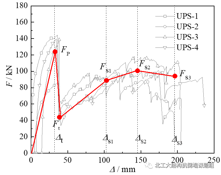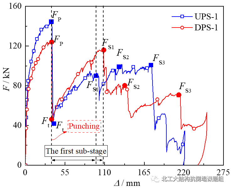 图3是UPS-1和DPS-1的承载力-位移曲线。冲剪破坏前,试件通过受弯抵抗外荷载。冲剪破坏后第一阶段(The first sub-stage),节点由穿过冲剪裂缝的钢筋提供承载力。