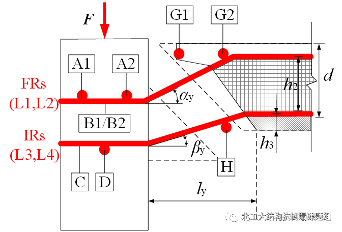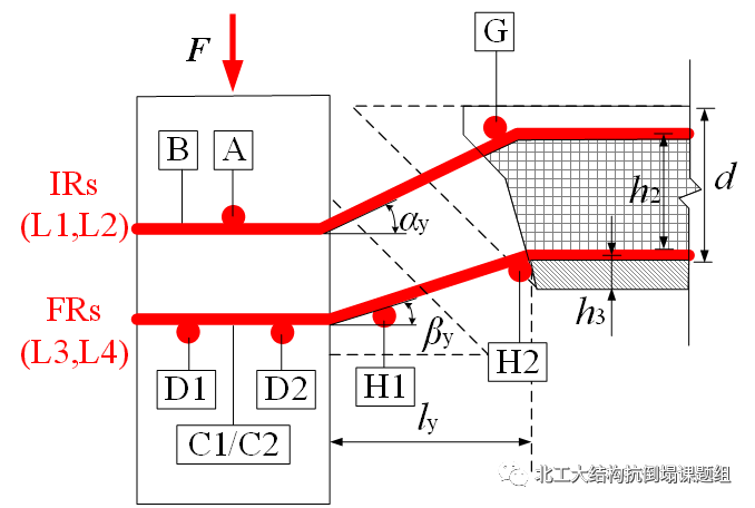 冲剪后承载力主要由穿柱的受弯钢筋(FRs)和整体性钢筋(IRs)提供。根据图4的机理示意图确定各层钢筋的转动变形和轴向应力,进而计算冲剪后承载力,这取决于钢筋受到的两类约束条件:1)钢筋有效约束,在大变形下最终断裂;2)钢筋受到部分混凝土约束,其应力状态可根据混凝土的抗崩裂强度确定。(具体推导和公式见论文)